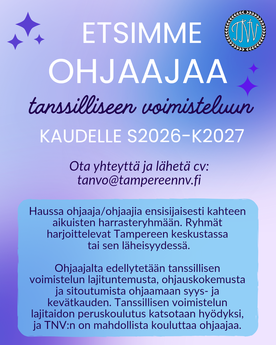 Haemme tanvo-ohjaajaa tuleville syys- ja kevätkausille 2026-2027! Ota yhteyttä: tanvo@tampereennv.fi!